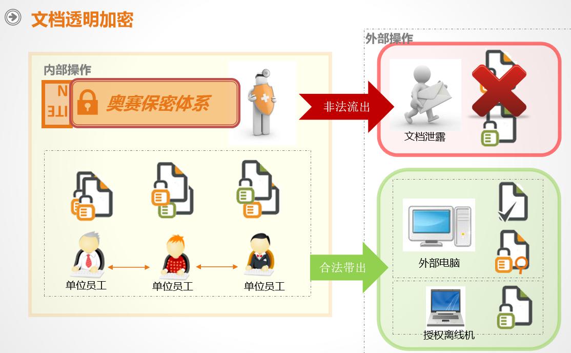 奧賽云盾采用先進(jìn)的文件內(nèi)核加密技術(shù),在無需人工干預(yù)、不影響員工辦公的前提下對數(shù)據(jù)進(jìn)行全程智能加密,在內(nèi)部環(huán)境可正常使用,脫離內(nèi)部授權(quán)環(huán)境則無法打開。根據(jù)實(shí)際業(yè)務(wù)需求可使用打開加密、修改加密、手動加密、智能加密等靈活多樣的加密策略。