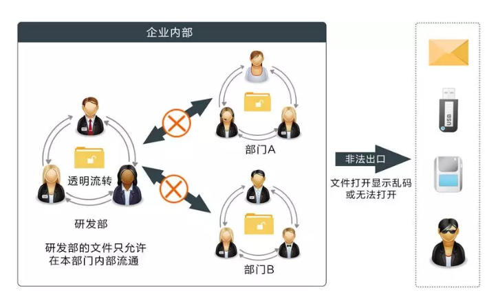 奧賽云盾采用驅動層加密技術,進行文件加密,不改變員工操作習慣、不改變文件格式、不封閉公司網絡、不封閉外設端口,內部流通自由正常。 加密文件在未授權的情況下脫離企業(yè)網絡,文件就無法正常訪問,形成“對外受阻,對內無礙”局面!有效保障企業(yè)的數據安全。