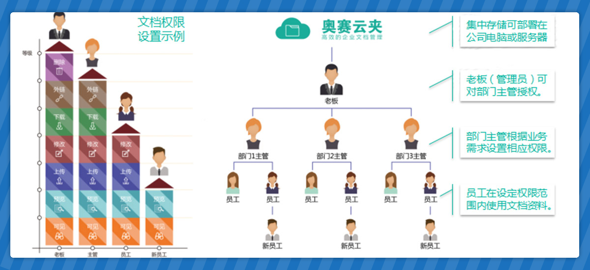 文件/文件夾,靈活設(shè)置。權(quán)限繼承,離職交接更快。多級管理員,管理更高效。