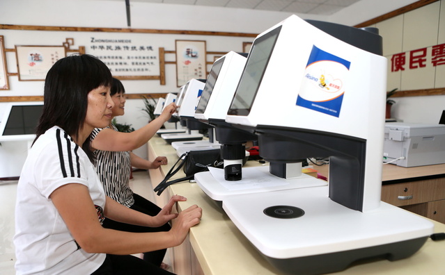 6月22日,山東即墨市藍(lán)村鎮(zhèn)王演莊北村的村民王芳(前)通過“智能蓋章機(jī)”辦理蓋章手續(xù)。日前,即墨市首批“智能蓋章機(jī)”在藍(lán)村鎮(zhèn)王演莊社區(qū)服務(wù)中心投入使用?!爸悄苌w章機(jī)”具有頭像掃描、資料蓋章、圖文存檔、信息查閱等功能,村民辦理戶口遷移、政策補(bǔ)貼等用章事物時可自助辦理。