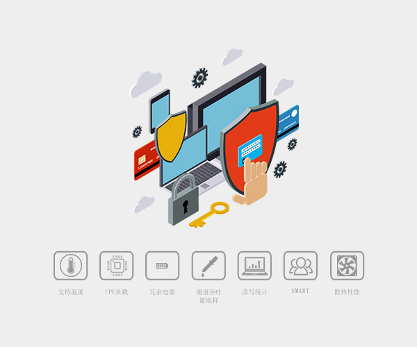 支持硬盤、溫度、CPU負(fù)載、冗余電源、通道吞吐量取樣、讀寫統(tǒng)計、SMART等多種監(jiān)控組件,同時對硬盤、風(fēng)扇、電源等重要部件故障會通過電子郵件、LED燈、高音音頻等方式給管理員以報警提示,以便及時處理存儲設(shè)備故障